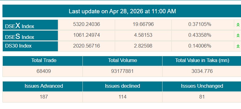 সূত্র মতে, এদিন ডিএসইর লেনদেন শুরুর প্রথম ঘণ্টা অর্থাৎ বেলা ১১ টা পর্যন্ত ডিএসইর প্রধান সূচক বা ‘ডিএসইএক্স’ ১৯ দশমিক ৬৬ পয়েন্ট বেড়ে অবস্থান করছে ৫ হাজার ৩২০ পয়েন্টে।