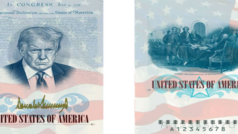 পাসপোর্টের ভেতরের কভারে থাকবে প্রেসিডেন্ট ট্রাম্পের একটি বড় ছবি। ছবির চারপাশে যুক্তরাষ্ট্রের স্বাধীনতার ঘোষণাপত্রের লেখা, জাতীয় পতাকা এবং সোনালি রঙে প্রেসিডেন্টের স্বাক্ষর যুক্ত করা হবে।