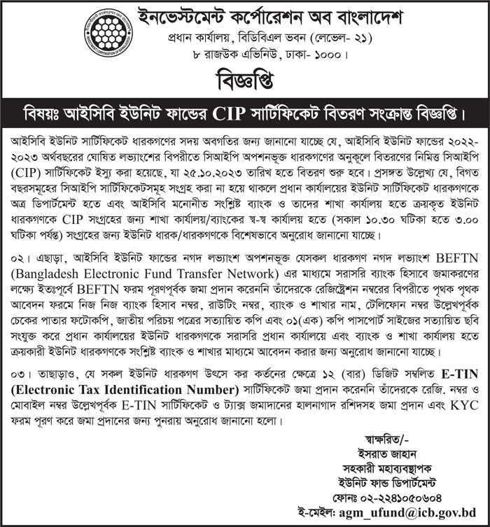 আইসিবি ইউনিট ফান্ডের CIP সার্টিফিকেট বিতরণ সংক্রান্ত বিজ্ঞপ্তি