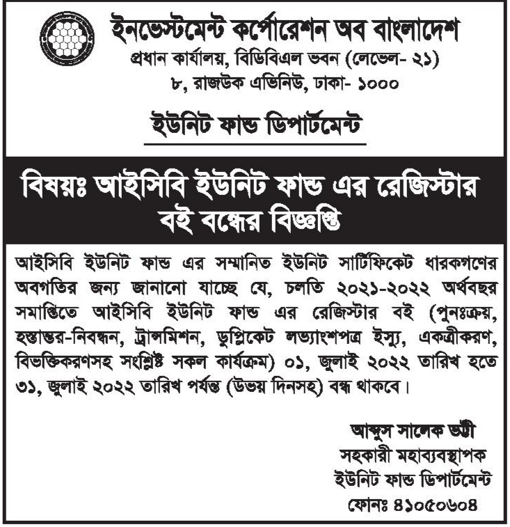 আইসিবি ইউনিট ফান্ড এর রেজিস্টার বই বন্ধের বিজ্ঞপ্তি
