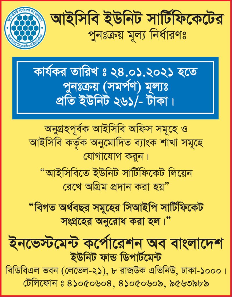 আইসিবি ইউনিট সার্টিফিকেটের পুনঃক্রয় মূল্য নির্ধারণ