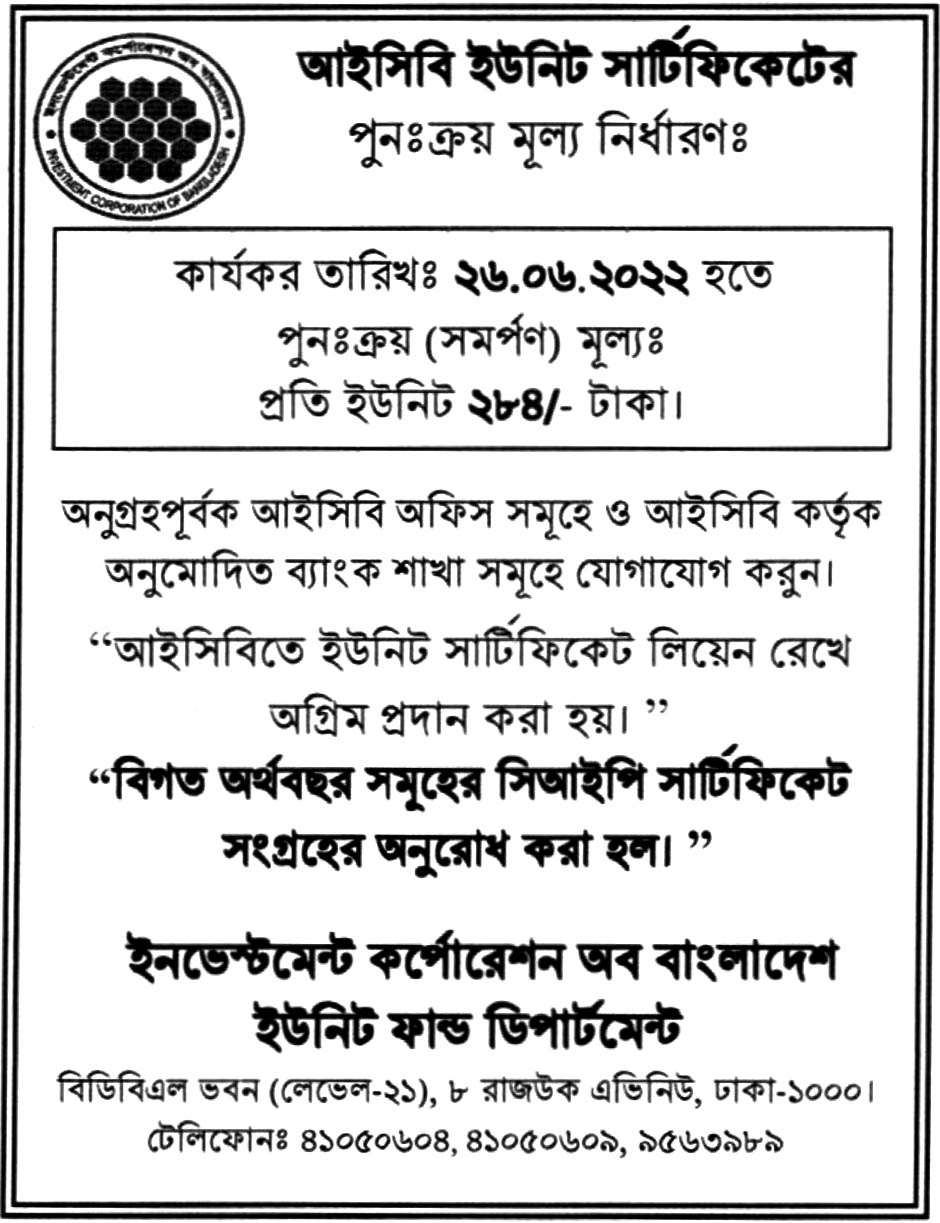 আইসিবি ইউনিট সার্টিফিকেটের পুনঃক্রয় মূল্য নির্ধারণ