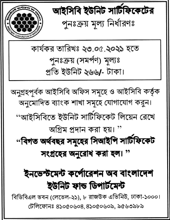 আইসিবি ইউনিট সার্টিফিকেটের পুনঃক্রয় মূল্য নির্ধারণ