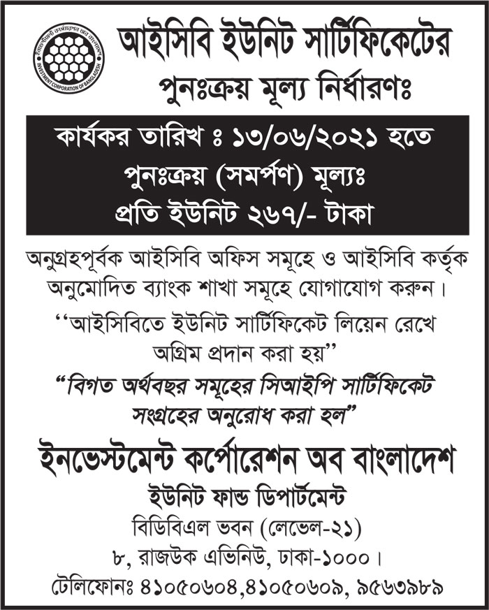 আইসিবি ইউনিট সার্টিফিকেটের পুনঃক্রয় মূল্য নির্ধারণ