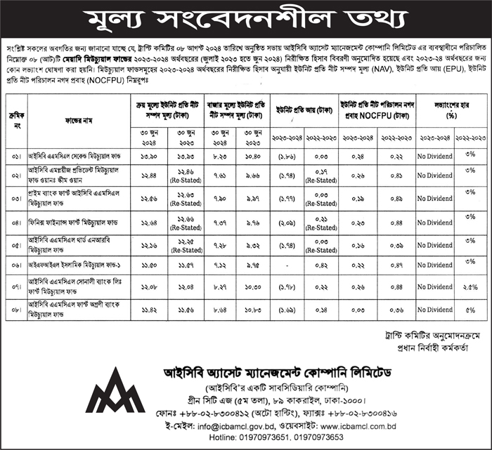 আইসিবি এএমসিএল এর ব্যবস্থাধীনে পরিচালিত ৮টি মিউচ্যুয়াল ফান্ড এর মূল্য সংবেদনশীল তথ্য সংক্রান্ত বিজ্ঞপ্তি