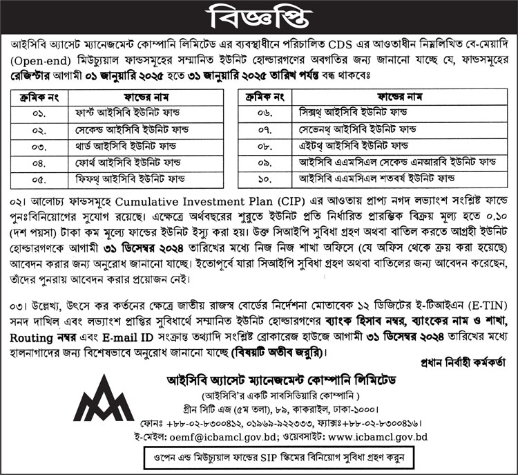 আইসিবি এএমসিএল এর ব্যবস্থাধীনে পরিচালিত সিডিএসভুক্ত ১০টি মিউচ্যুয়াল ফান্ডসমূহের রেজিস্ট্রার বন্ধ সংক্রান্ত বিজ্ঞপ্তি