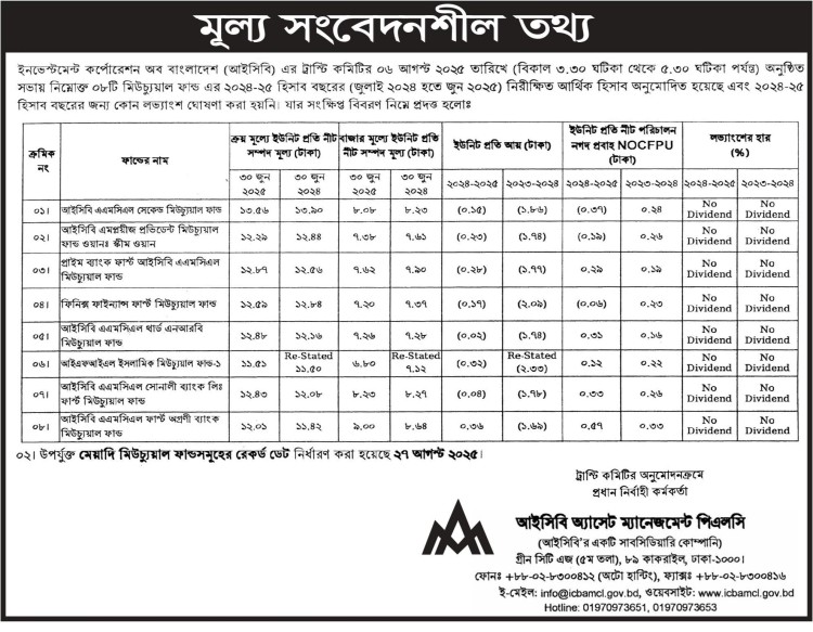 আইসিবি এএমসিএল এর ব্যবস্থাধীনে পরিচালিত ৮টি মিউচ্যুয়াল ফান্ড এর মূল্য সংবেদনশীল তথ্য সংক্রান্ত বিজ্ঞপ্তি