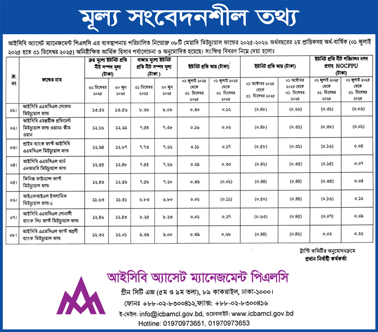আইসিবি এএমসিএল এর ব্যবস্থাধীনে পরিচালিত ৮টি মিউচ্যুয়াল ফান্ড এর মূল্য সংবেদনশীল তথ্য সংক্রান্ত বিজ্ঞপ্তি