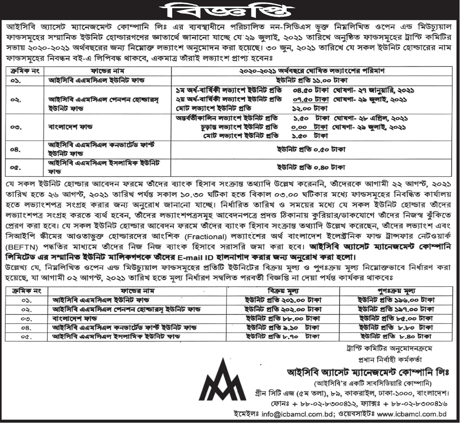 আইসিবি এএমসিএল এর ব্যবস্থাধীনে পরিচালিত নন-সিডিএস ভুক্ত ওপেন এন্ড মিউচ্যুয়াল ফান্ডসমূহের ২০২০-২০২১ অর্থবছরের জন্য লভ্যাংশ ঘোষণা ও প্রতিটি ইউনিট ফান্ডের বিক্রয় মূল্য ও পুন:ক্রয় মূল্য নির্ধারণ সংক্রান্ত সংযুক্ত বিজ্ঞপ্তি