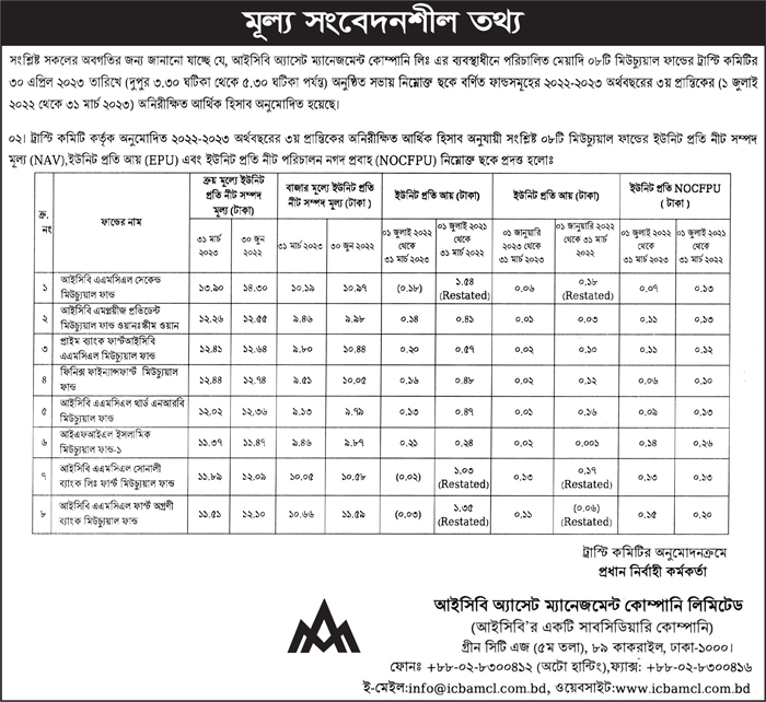 আইসিবি এএমসিএল এর ব্যবস্থাধীনে পরিচালিত ৮টি মিউচ্যুয়াল ফান্ড এর মূল্য সংবেদনশীল তথ্য সংক্রান্ত বিজ্ঞপ্তি