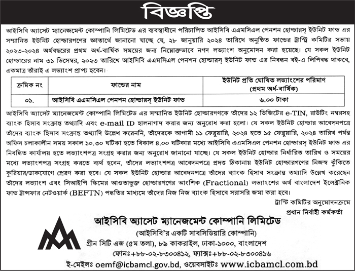 আইসিবি এএমসিএল এর ব্যবস্থাধীনে পরিচালিত আইসিবি এএমসিএল পেনশন হোল্ডারস্ ইউনিট ফান্ড এর ২০২৩-২৪ অর্থবছরের অনিরীক্ষিত ১ম অর্ধ বার্ষিক নগদ লভ্যাংশ অনুমোদন সংক্রান্ত বিজ্ঞপ্তি
