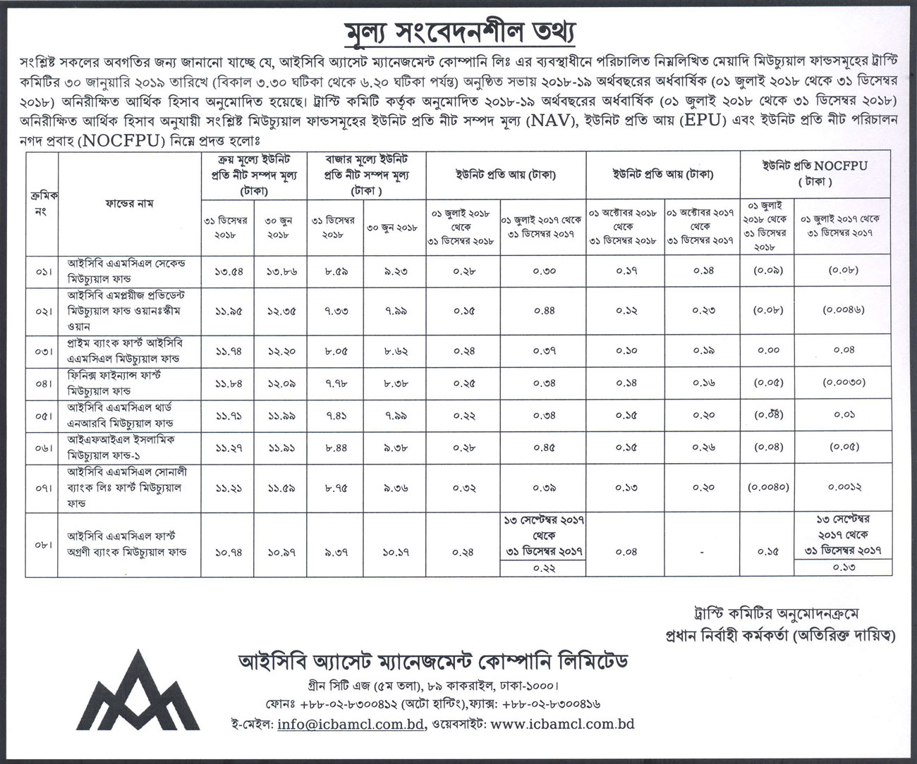 আইসিবি এএমসিএল এর ব্যবস্থাধীনে পরিচালিত ৮টি মিউচ্যুয়াল ফান্ড এর মূল্য সংবেদনশীল তথ্য সংক্রান্ত বিজ্ঞপ্তি