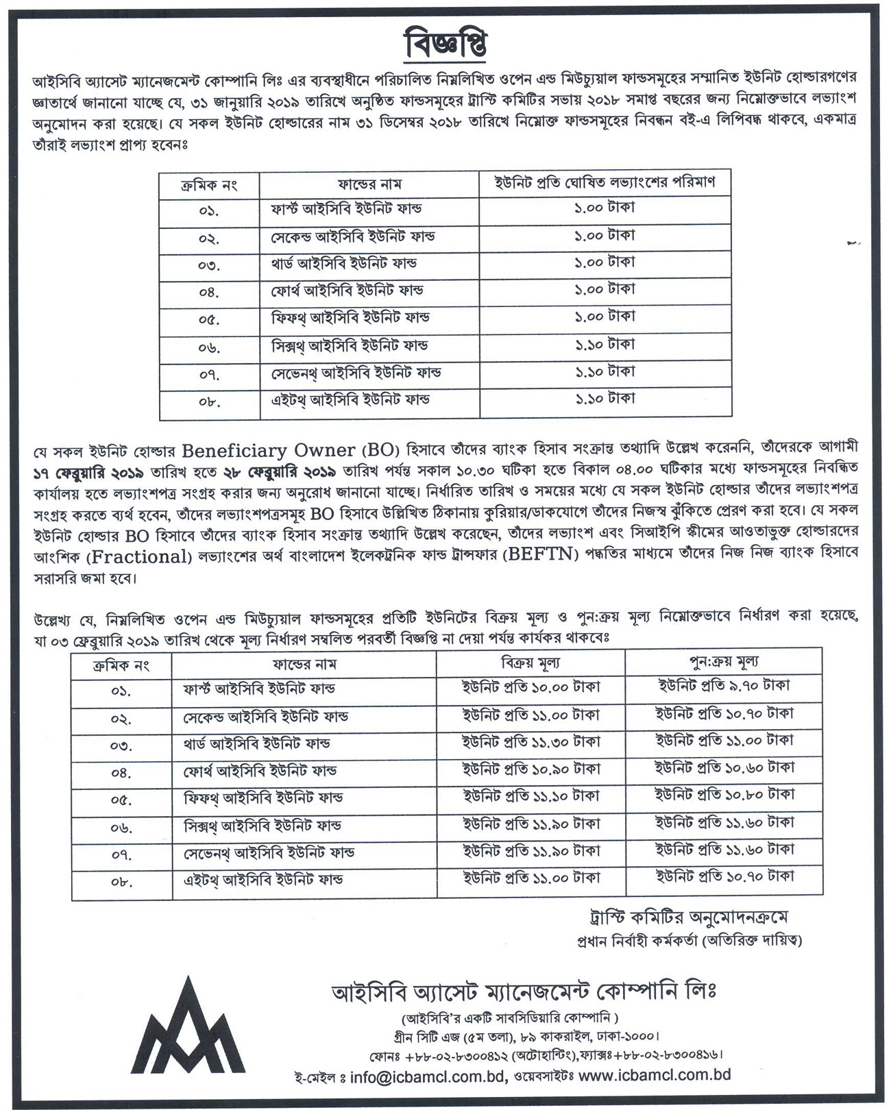 আইসিবি এএমসিএল এর ব্যবস্থাধীনে পরিচালিত মিউচ্যুয়াল ফান্ডসমূহের লভ্যাংশ সংক্রান্ত বিজ্ঞপ্তি
