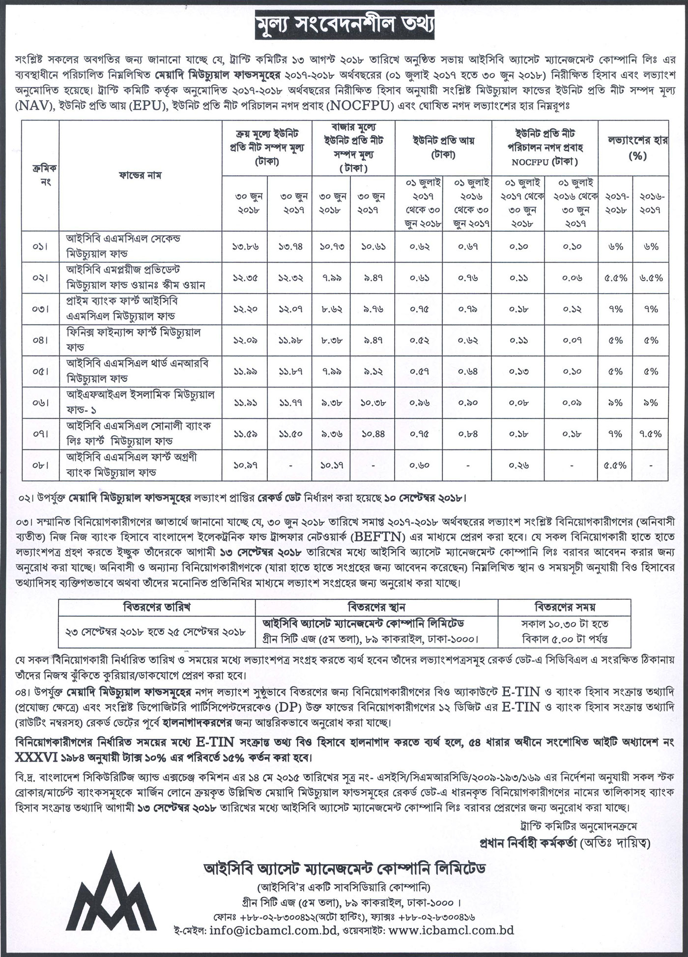 আইসিবি এএমসিএল এর ব্যবস্থাধীনে পরিচালিত ৮টি মিউচ্যুয়াল ফান্ড এর মূল্য সংবেদনশীল তথ্য সংক্রান্ত বিজ্ঞপ্তি