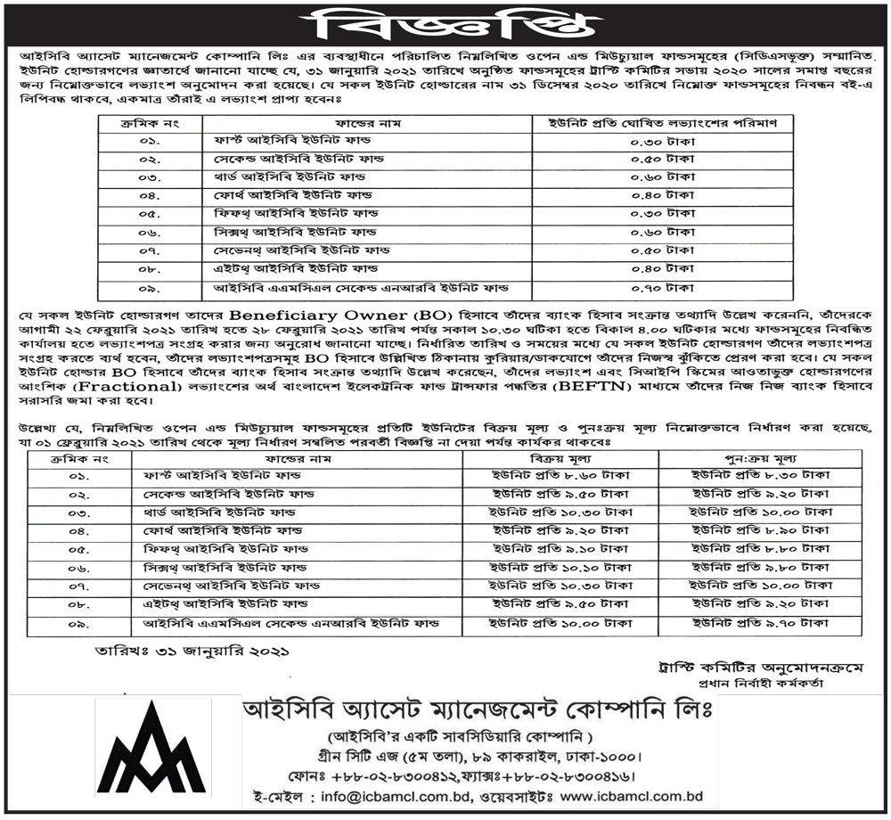 আইসিবি এএমসিএল এর ব্যবস্থাধীনে পরিচালিত মিউচ্যুয়াল ফান্ডসমূহের লভ্যাংশ সংক্রান্ত বিজ্ঞপ্তি