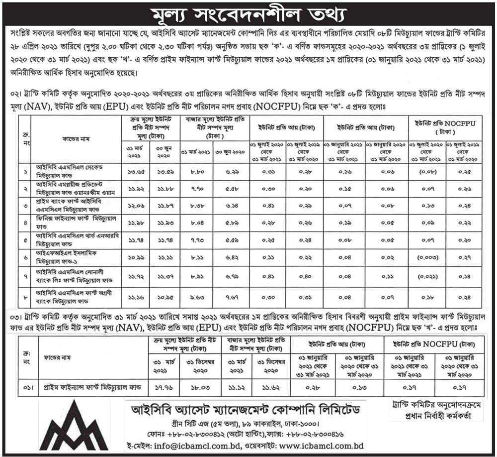 আইসিবি এএমসিএল এর ব্যবস্থাধীনে পরিচালিত ৮টি মিউচ্যুয়াল ফান্ড এর মূল্য সংবেদনশীল তথ্য সংক্রান্ত বিজ্ঞপ্তি