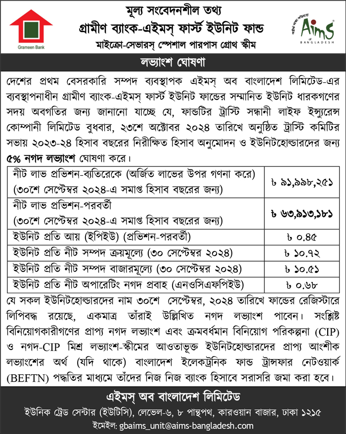 গ্রামীণ ব্যাংক-এইমস্ ফার্স্ট ইউনিট ফান্ডের লভ্যাংশ ঘোষণা