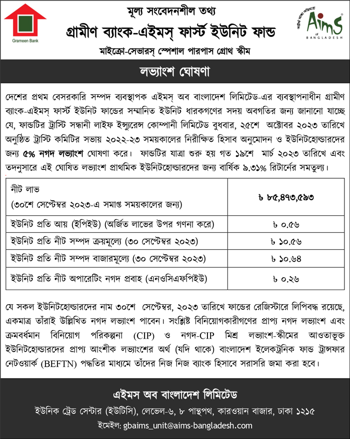 গ্রামীণ ব্যাংক-এইমস্ ফার্স্ট ইউনিট ফান্ডের লভ্যাংশ ঘোষণা