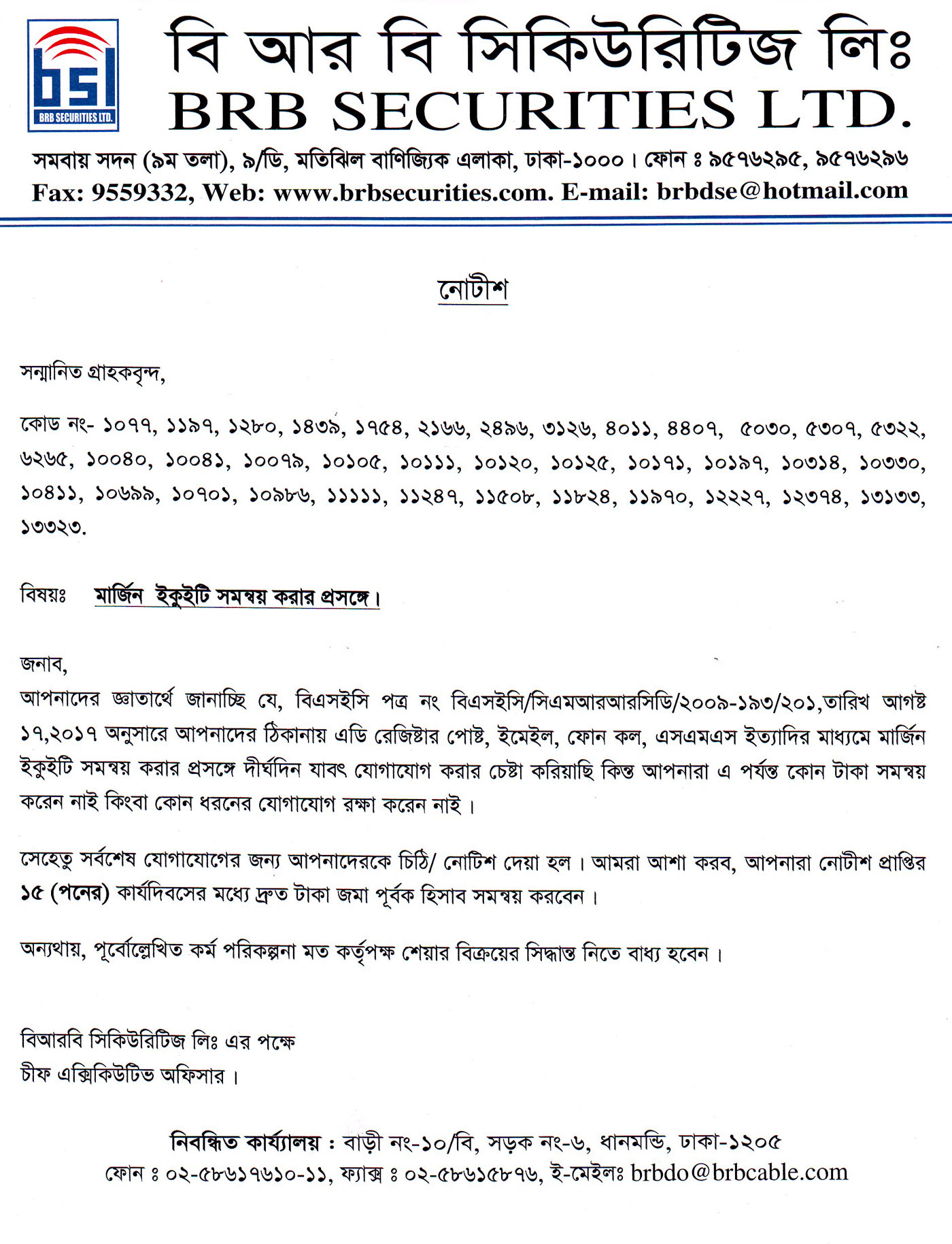 বি আর বি সিকিউরিটিজ লিঃ এর মার্জিন ইকুইটি সমন্বয়