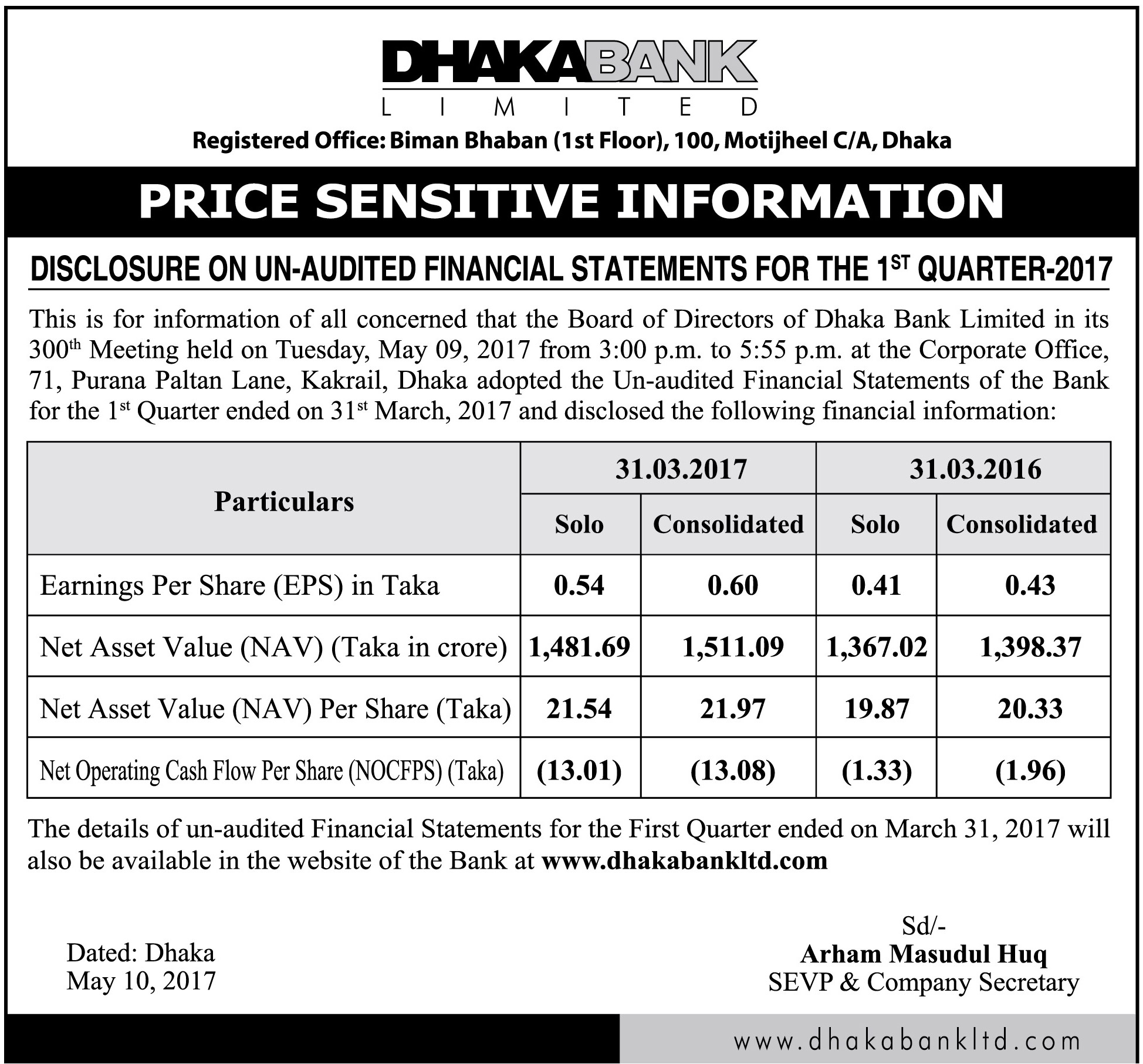1Q (Un-audited) Financial Statement of Dhaka Bank Limited