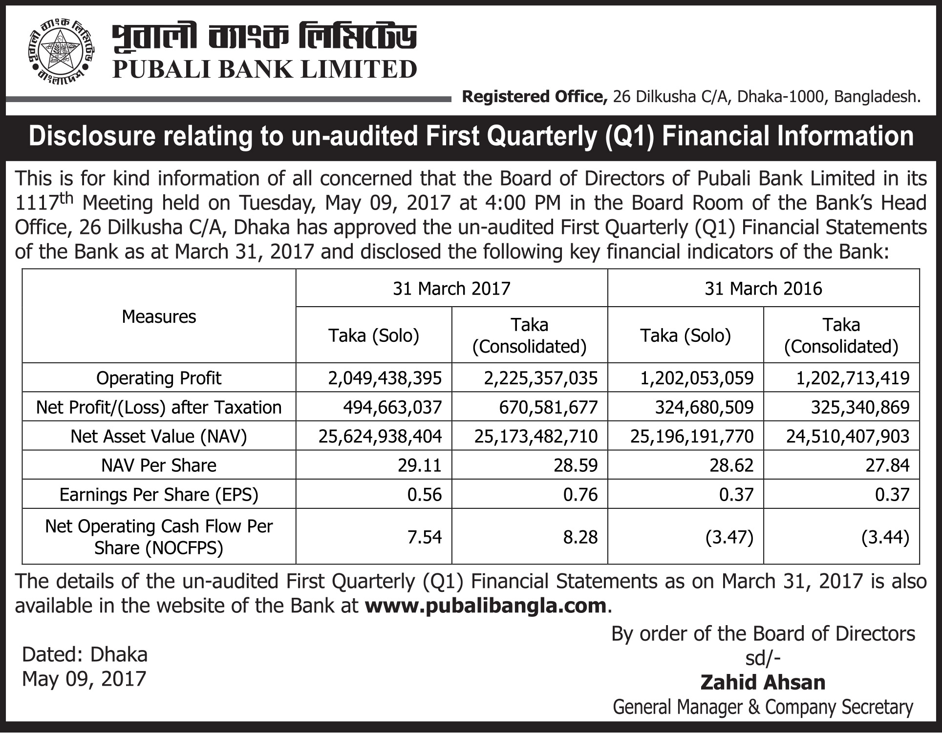 Q1 Financial Statements of Pubali Bank PLC.