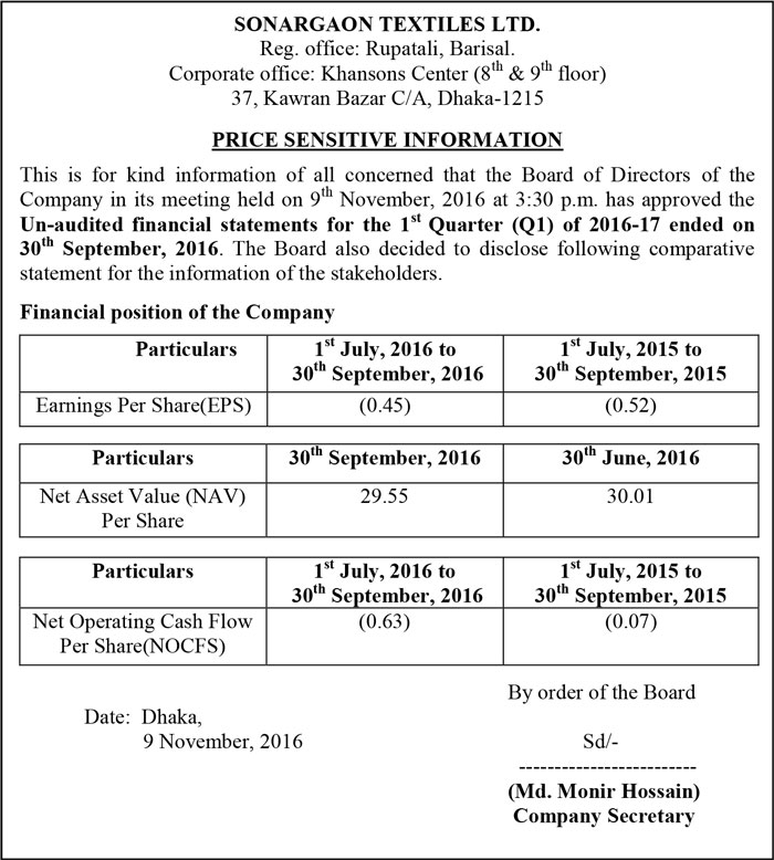 Price Sensitive Information Of Sonargaon Textiles LTD.