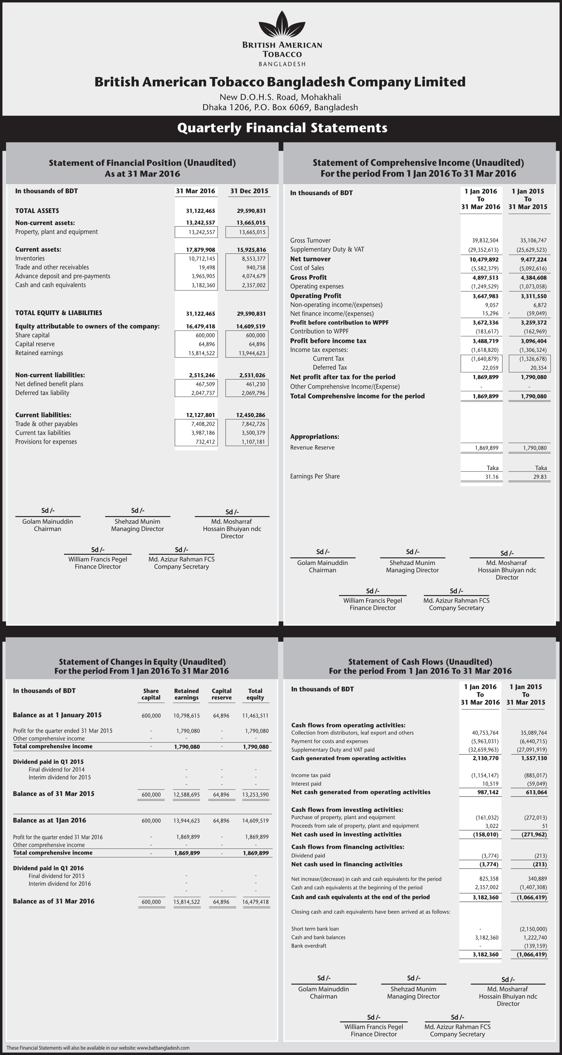 1st Quarter Financial Statement of British American Tobacco Bangladesh Company Limited