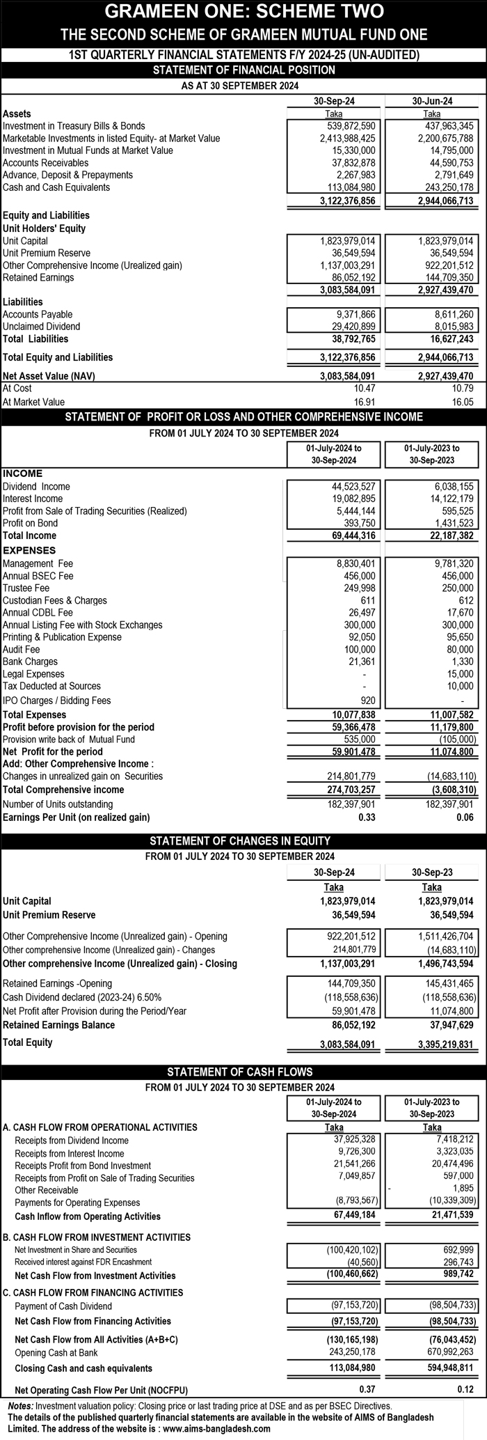 1st Quarterly Price Sensitive Information (PSI) and Financial Statements of Grameen One: Scheme Two