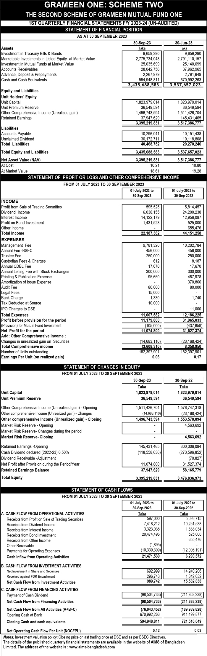 1st Quarterly Price Sensitive Information (PSI) and Financial Statements of Grameen One: Scheme Two