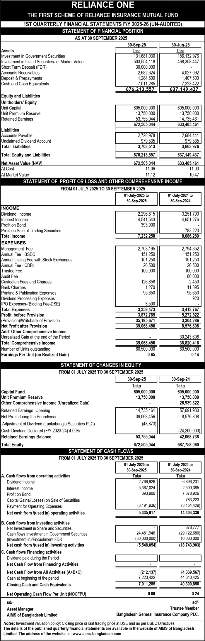 1st Quarterly Price Sensitive Information (PSI) and Financial Statements of Reliance One