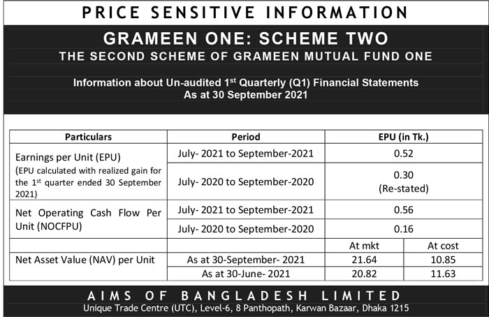 1st Quarterly Price Sensitive Information (PSI) and Financial Statements of Grameen One: Scheme Two