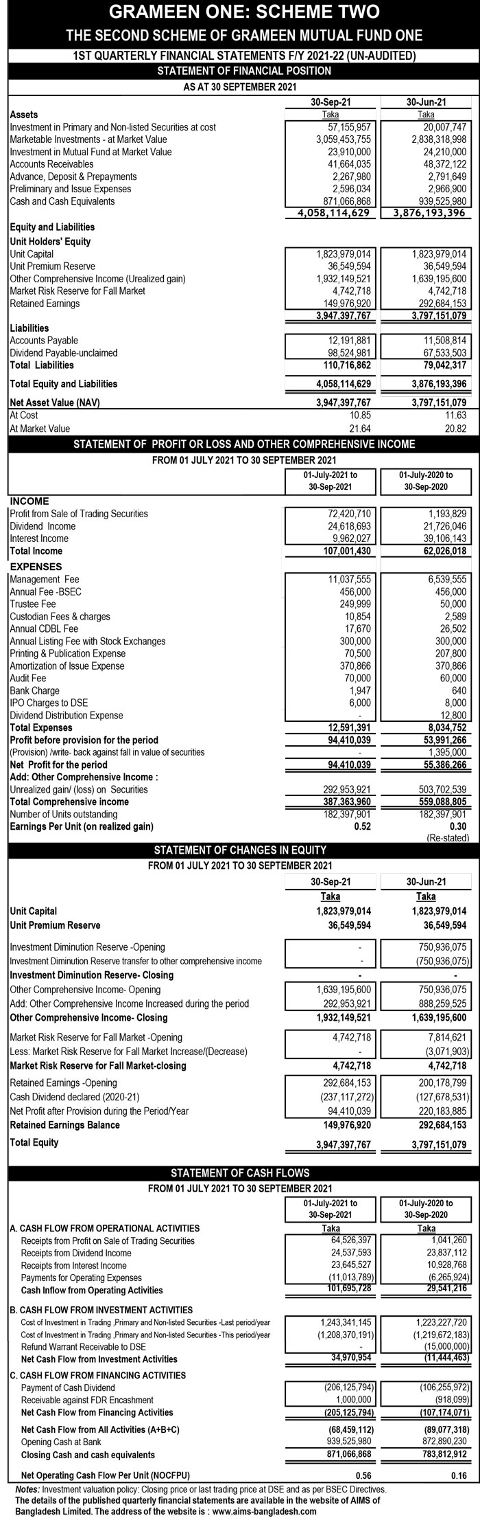 1st Quarterly PSI and un-audited Financial Statements 2021-22 of Grameen One: Scheme Two
