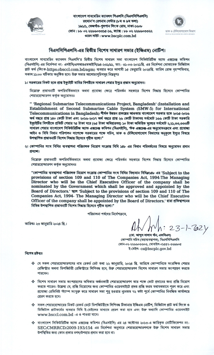 2nd EGM Notice of Bangladesh Submarine Cable PLC