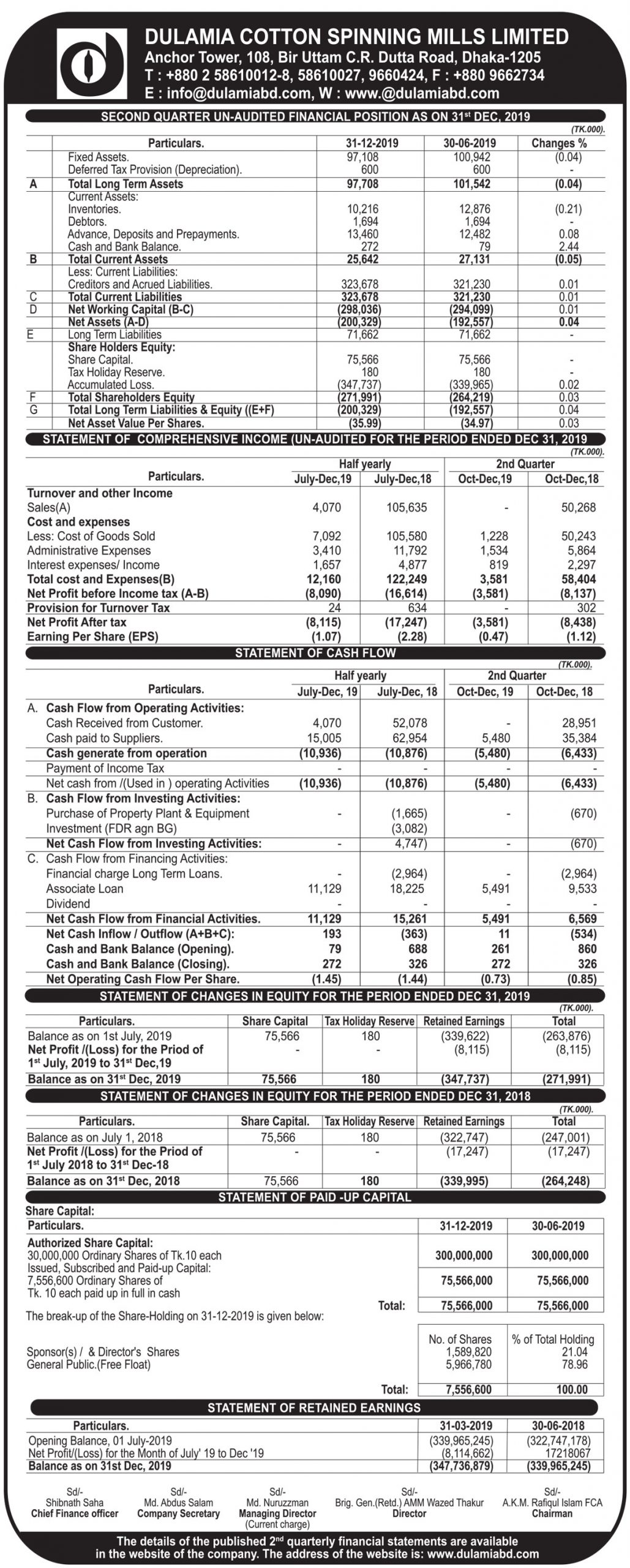 2nd Quarter un-audited Financial Statements of Dulamia Cotton Spinning Mills Limited