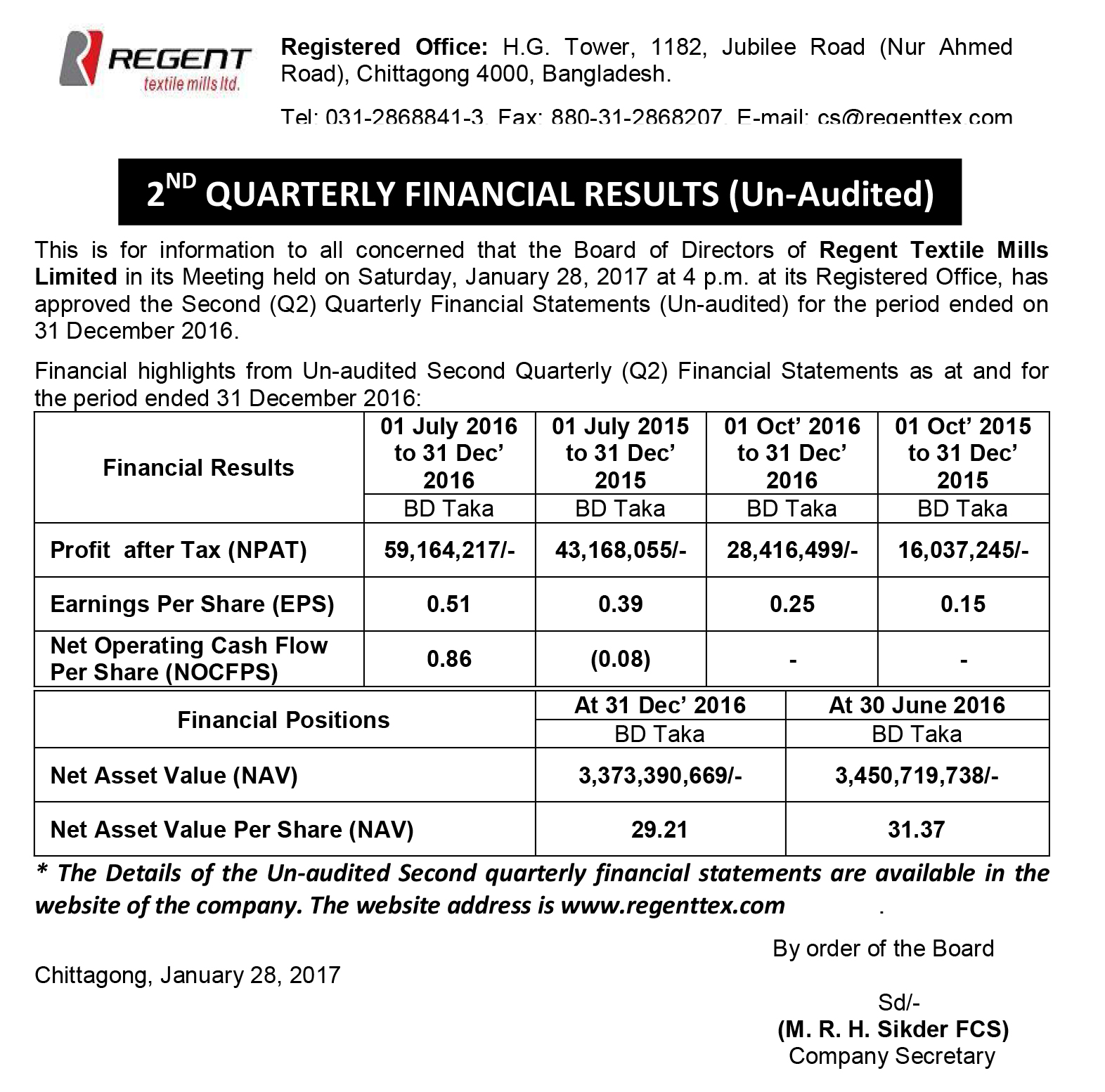 2Q Financial Results (Un-Audited) of Regent Textile Mills Ltd.