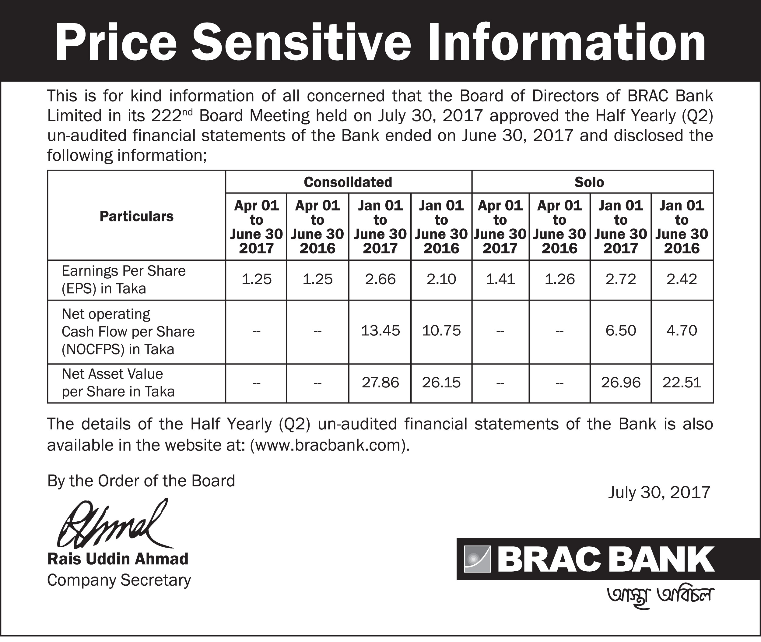 Price Sensitive Information (Q1) of BRAC Bank Limited