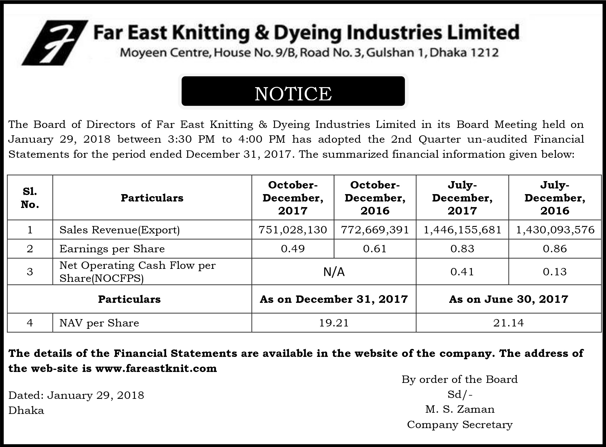 2Q Financial Statements of Far East Knitting & Dyeing Industries Limited