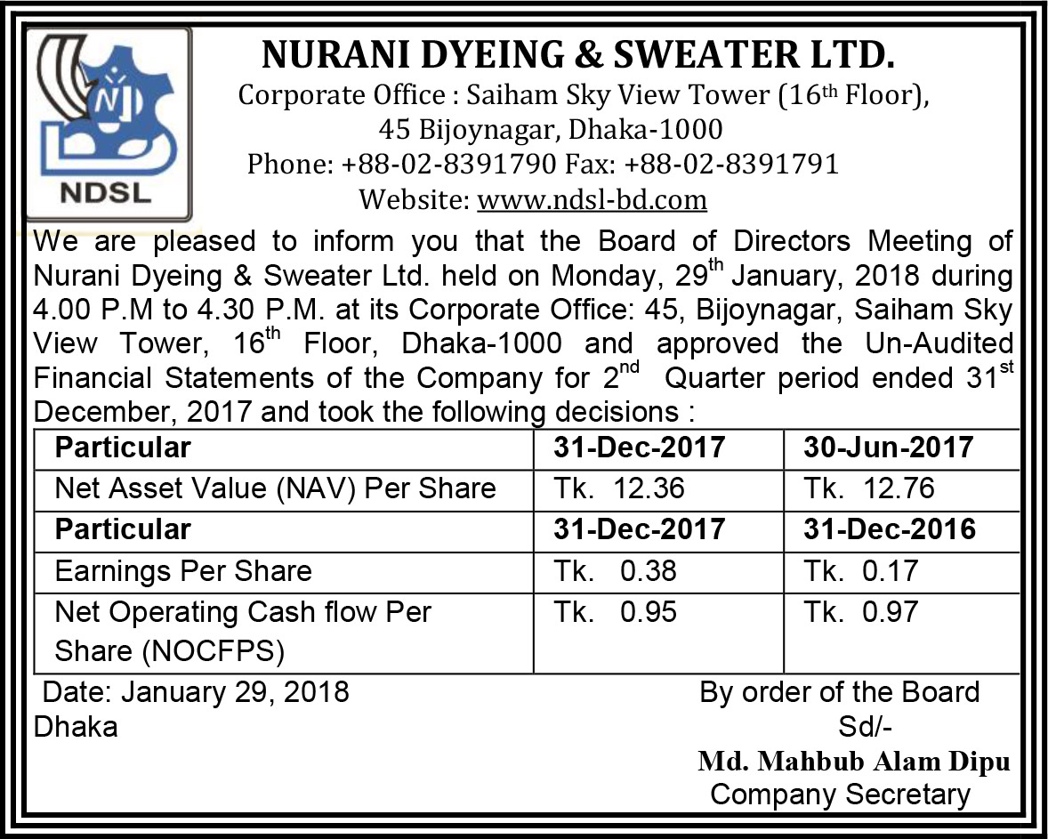 Price Sensitive Information of Nurani Dyeing &Sweater Ltd.