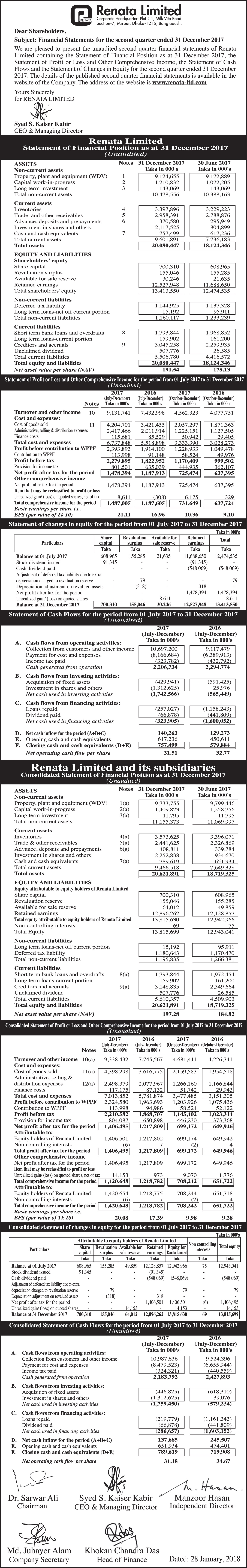 Half Yearly (Q2) Financial Statements (Unaudited) of Renata Limited