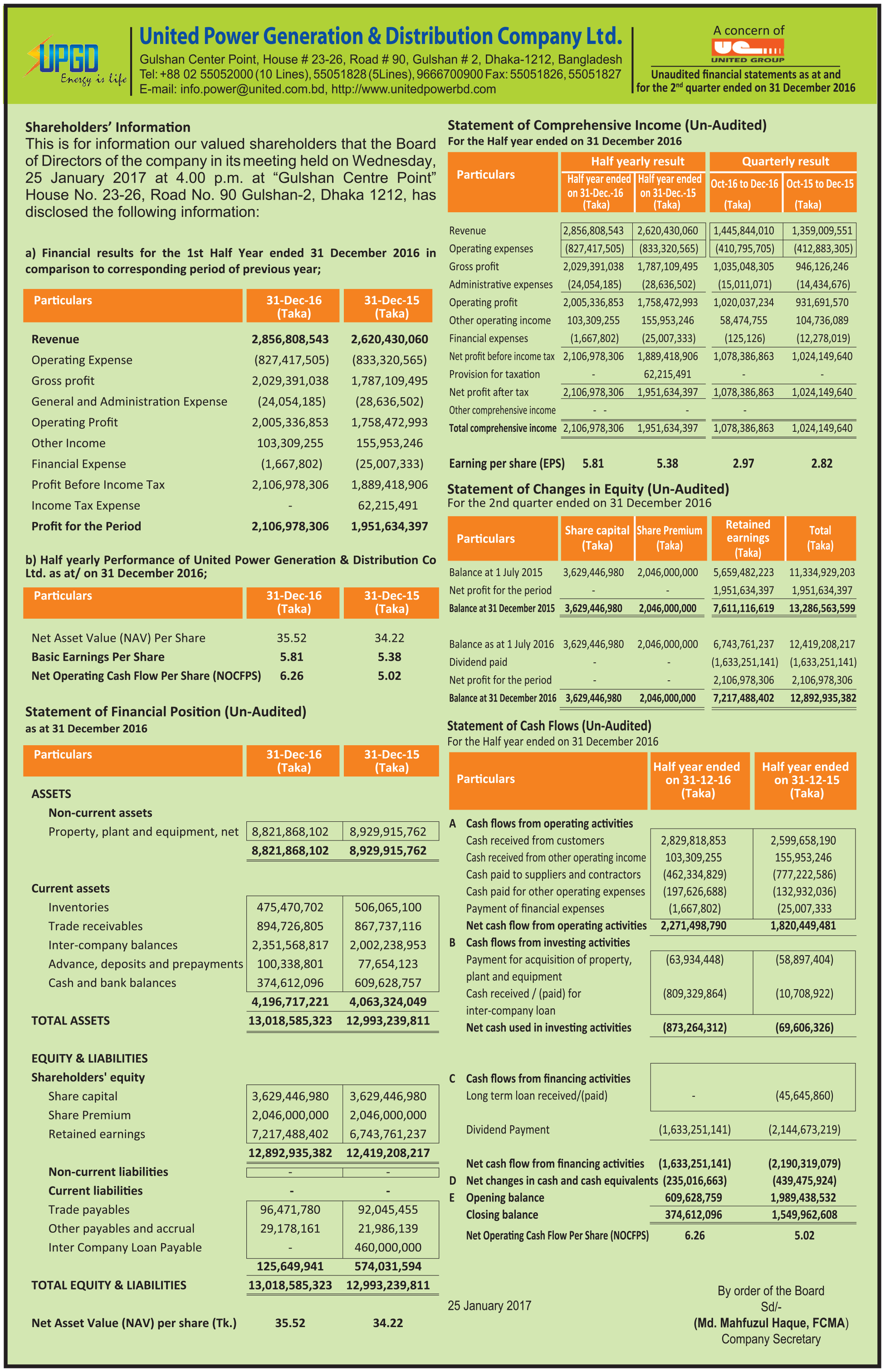 2Q Un-audited Financial Statement of United Power Generation & Distribution Company Ltd. Shareholders’ Information