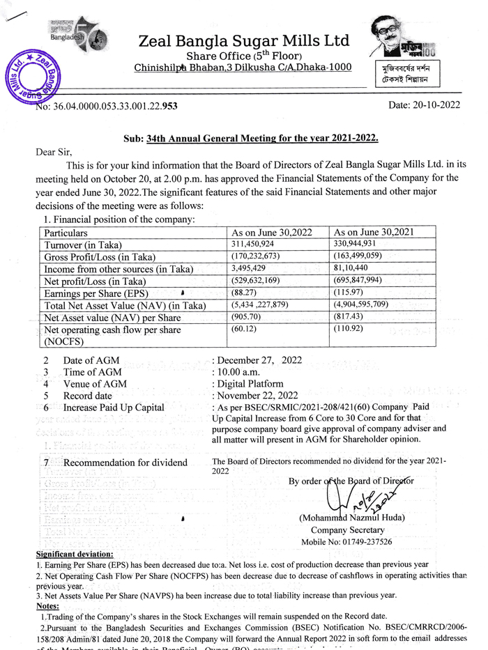 34th AGM Notice of Zeal Bangla Sugar Mills Ltd.