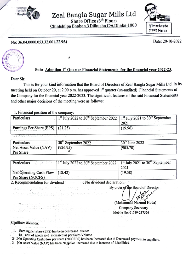 Q1 Financial Statements of Zeal Bangla Sugar Mills Ltd