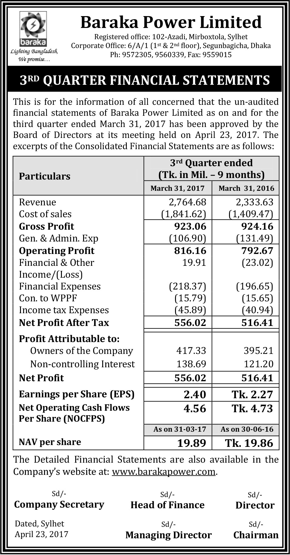 Notice to the Shareholders/Investors of Baraka Power Limited