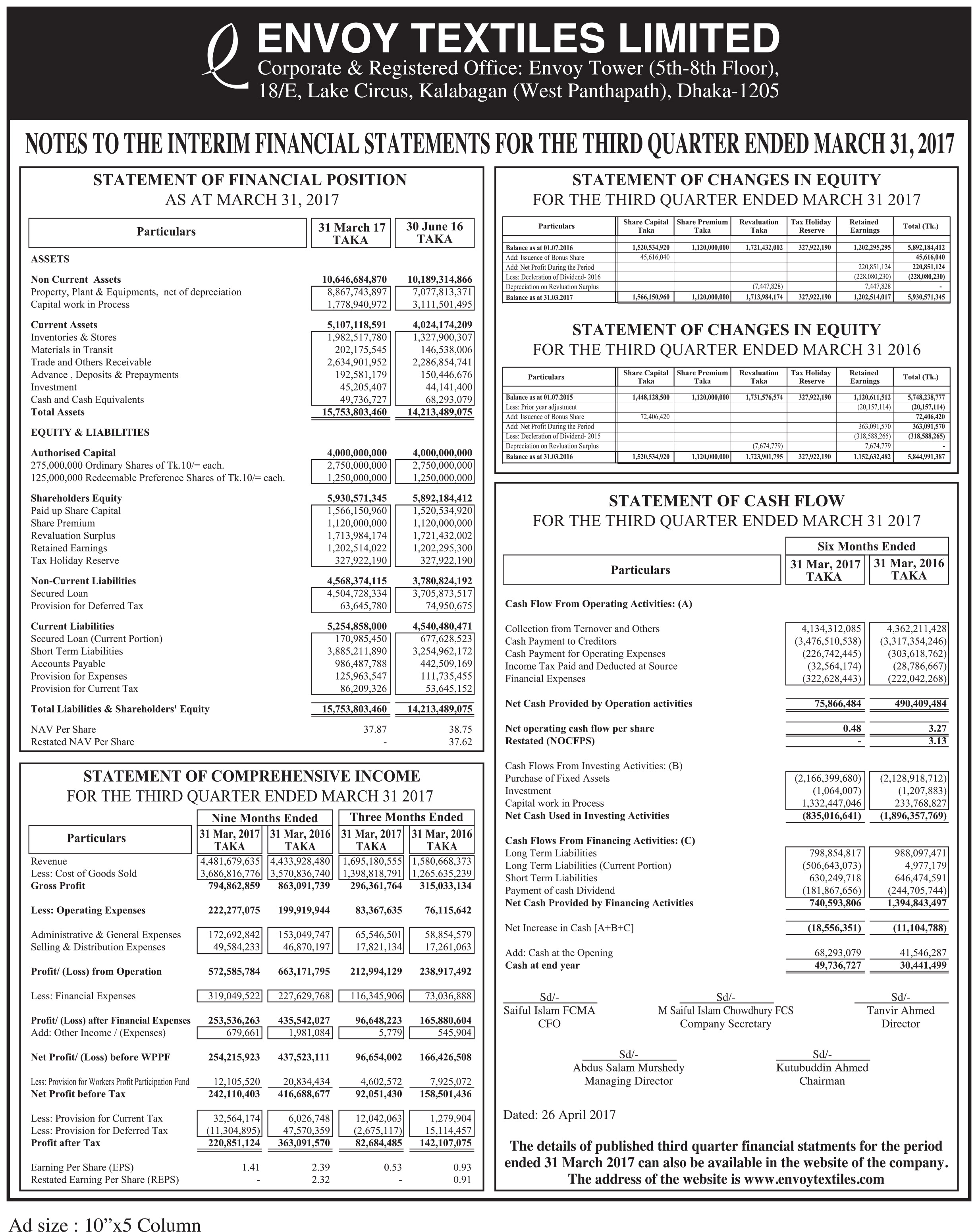 Half Yearly Un-audited Financial Statements of Envoy Textiles Limited