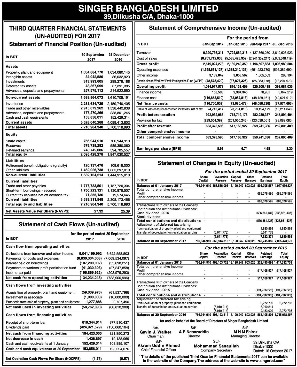 Q3 Un-audited Financial Statements of Singer Bangladesh Limited
