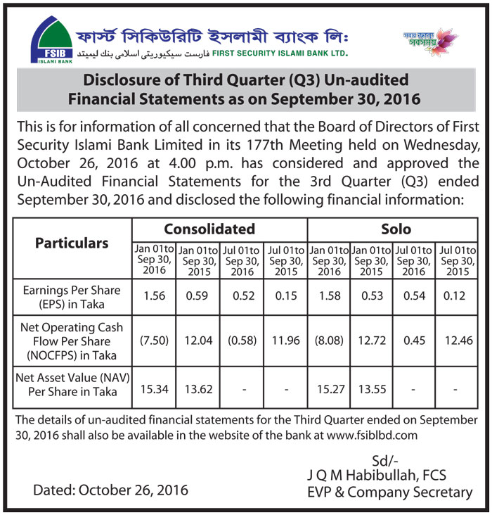 Q3 Un-audited Financial Statements of First Security Islami Bank PLC