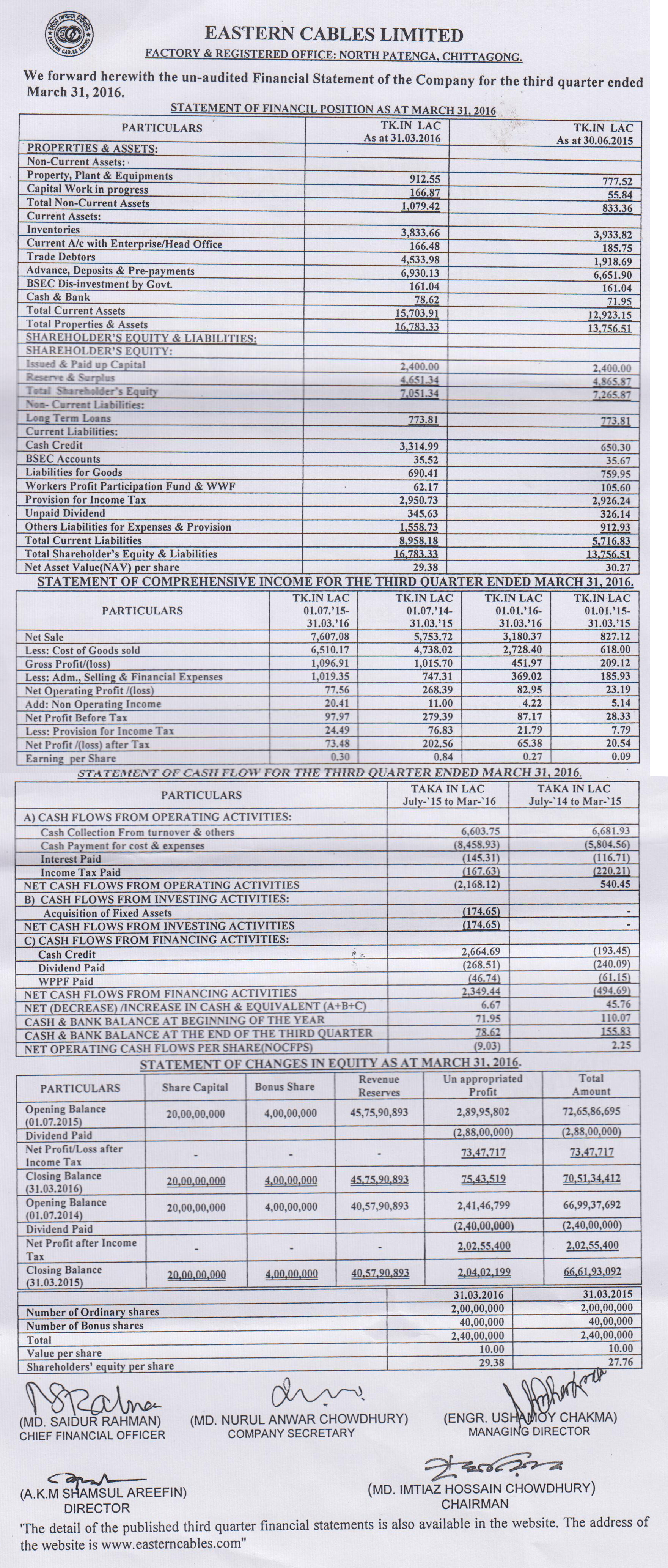 3rd Quarter Financial Statement (Un-audited) of Eastern Cables Limited