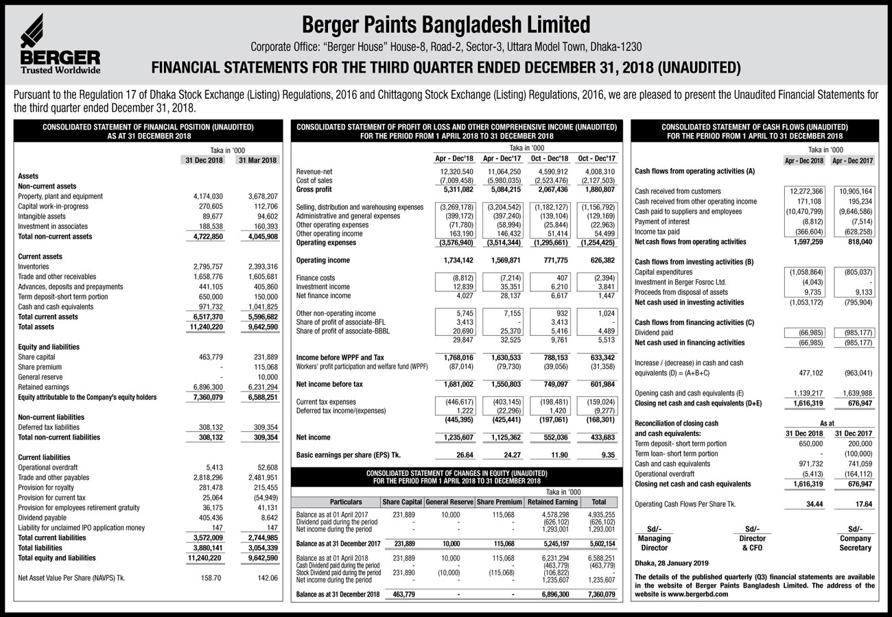 3rd Quarter Financial Statements (Un-audited) of Berger Paints Bangladesh Ltd