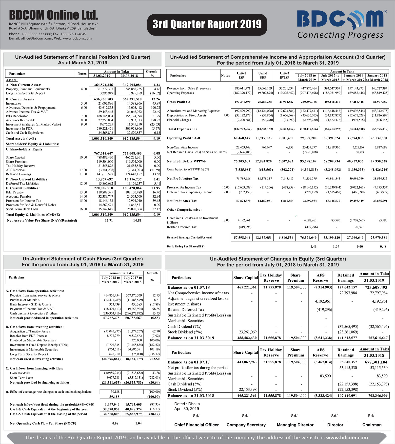 3rd Quarter Report 2019 of BDCOM Online Ltd