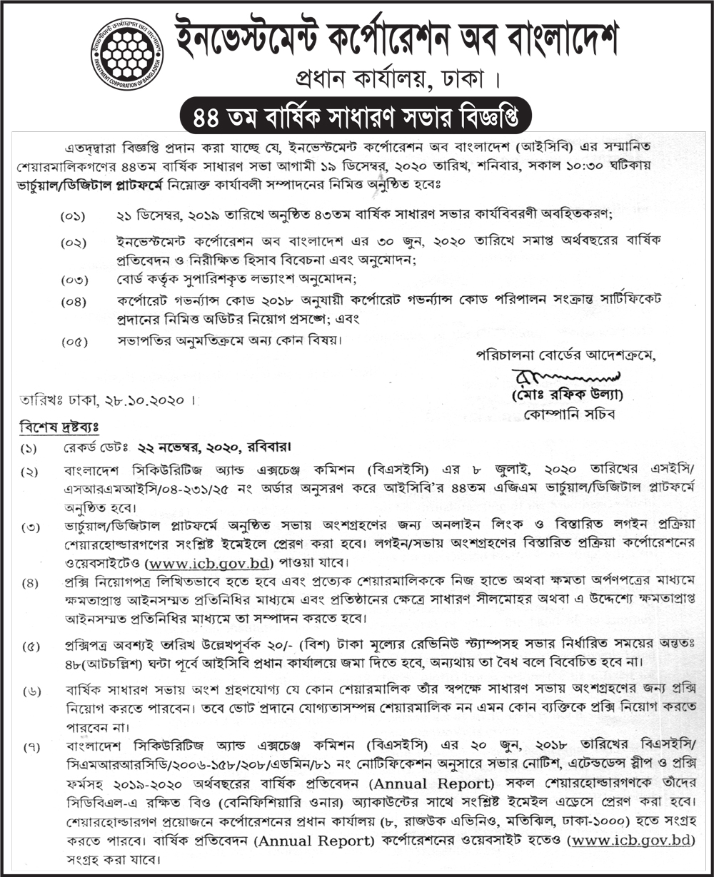 Notice of the 48th AGM of Investment Corporation of Bangladesh (ICB)